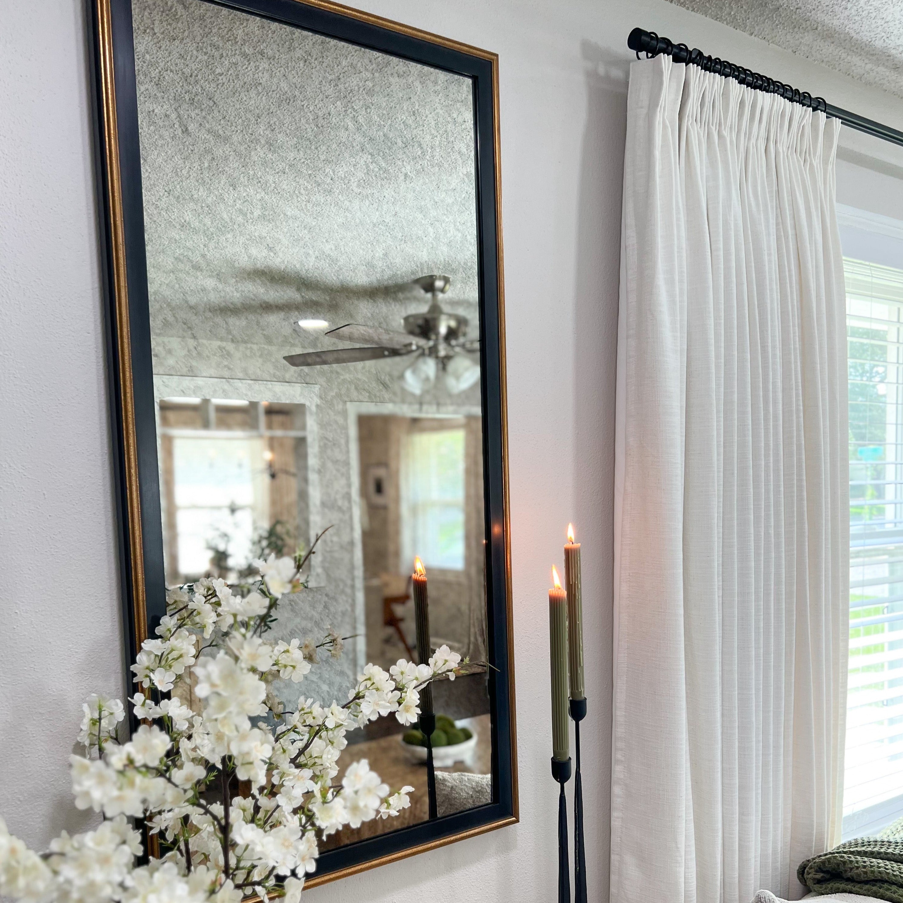 Begin by entering the desired height and width of your new custom framed mirror. Please note that the dimensions you select are for the outside edge of the frame, including the mirror.