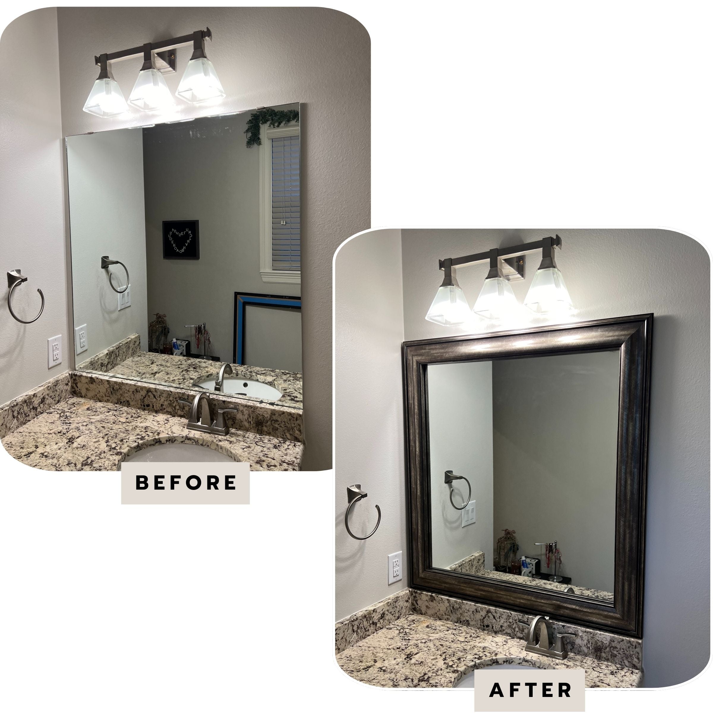In order to ensure your new frame adheres properly, we include free replacement mirror clips to replace any existing bulky, plastic clips already on your existing mirror. These replacement clips lie flat against your mirror. If you have bulky, plastic clips, please enter the number of replacement clips we need to include below.
