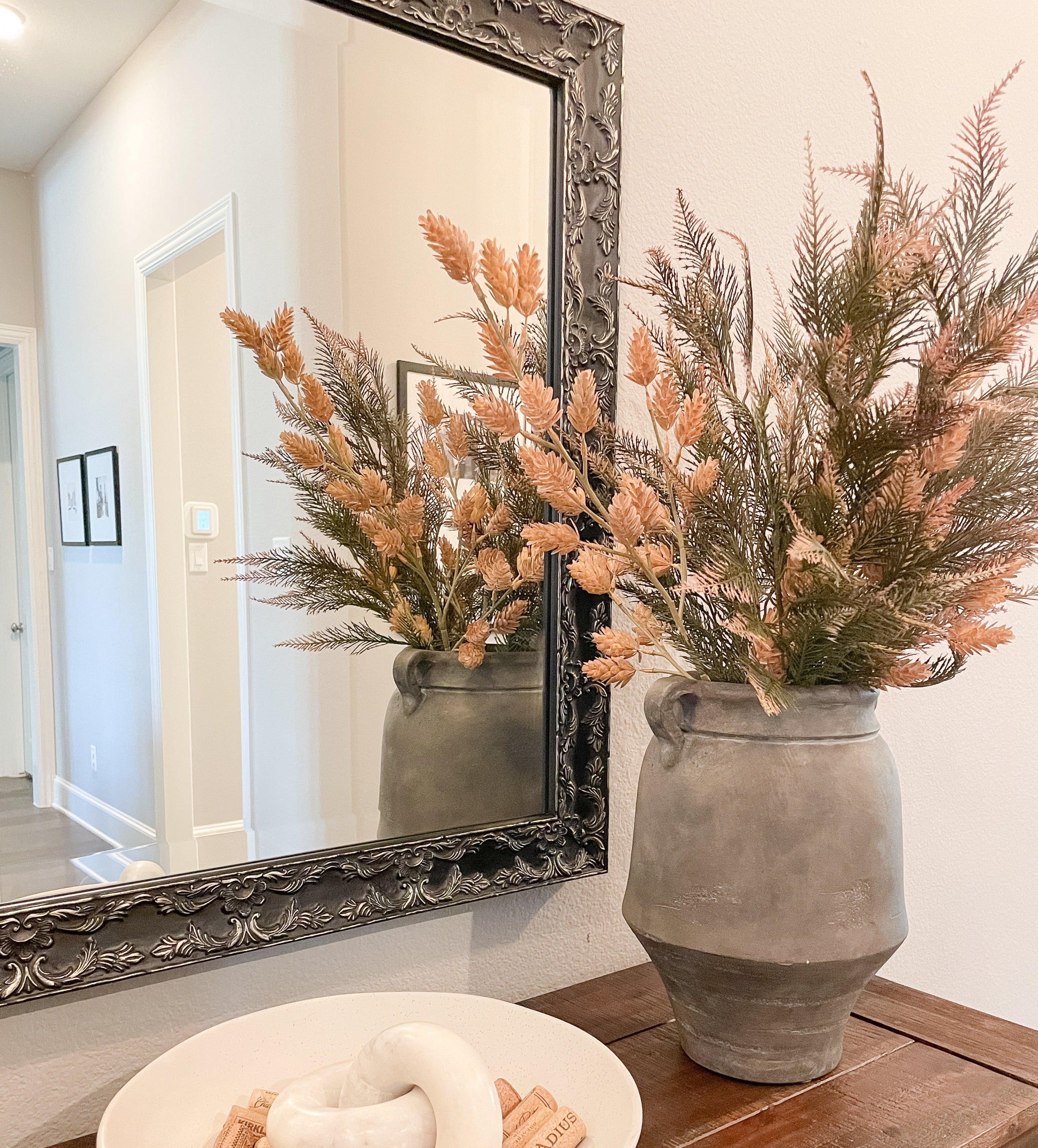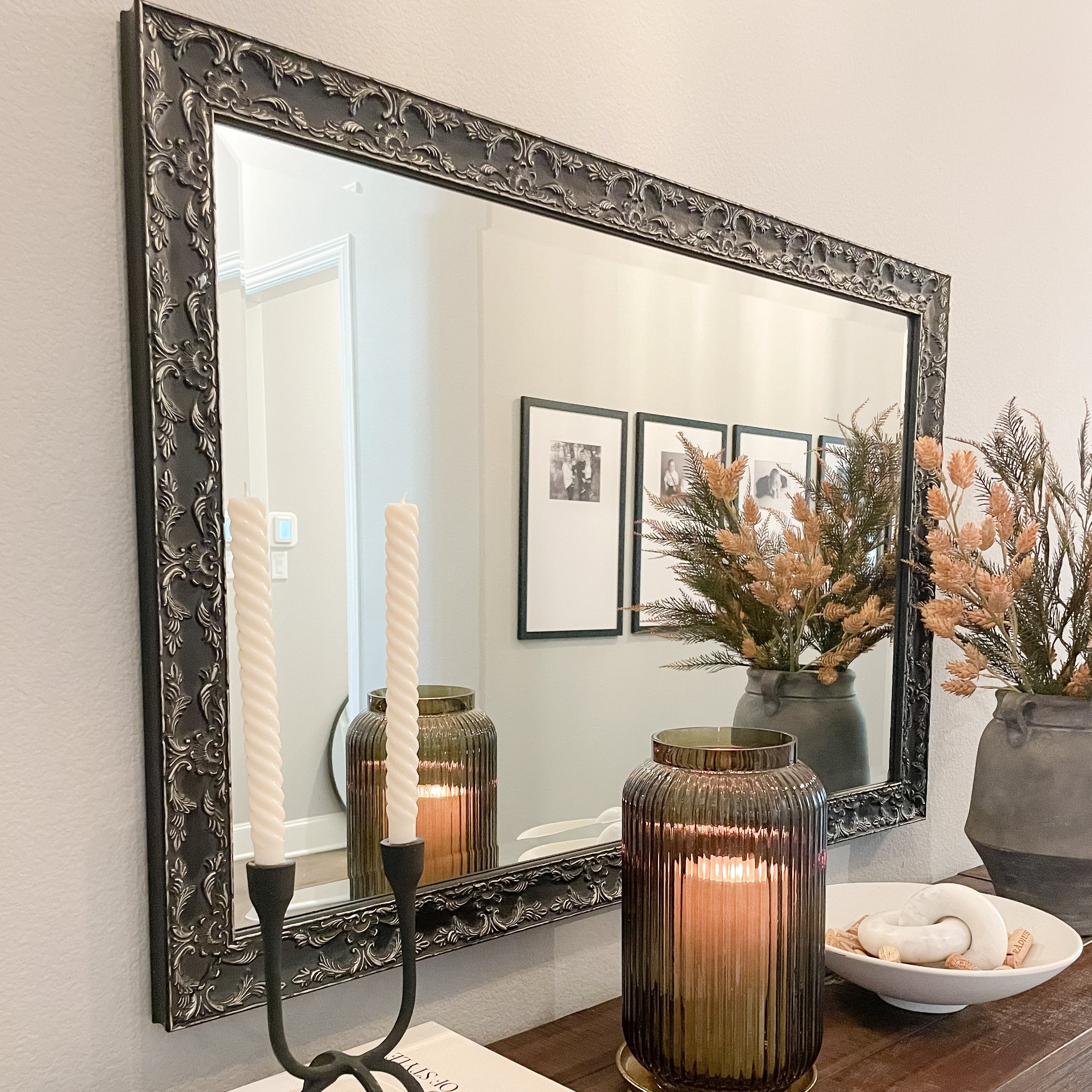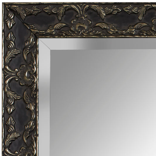 Delicate, raised designs grace the surface of the Maricopa, offering an ornate framed mirror option that maintains a feeling of simplicity. The buffed finish will give your custom mirror an antique look.