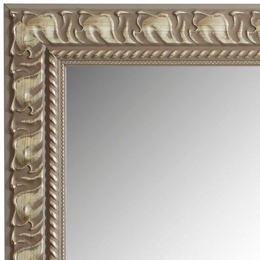 The Hillsborough frame adds an artistic touch to your mirror with an abstract design on the wide outer edge and scrollwork that rings the interior. The antiqued metallic finish highlights the beautiful details of this ornate framed mirror design.